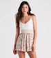 Love the way you look in this breezy floral romper for spring dates and events! It features a sleeveless V-neck. adjustable spaghetti straps that cross in the back. and a lace bodice with a sheer crochet waist leading to the flowy short hem. Complete the look in strappy platform heels.