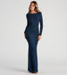 Make an illuminating entrance with a formal dress that glows under the spotlight. Francine features a crew neckline. long fitted sleeves. a daring open back. tie-back ties. ruching at the lower back. and a mermaid silhouette. The dress is composed of a glitter knit fabric that offers a form-hugging fit with moderate stretch. Complete the look with rhinestone heels and a clutch.