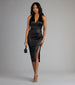 Effortlessly sleek and made to mesmerize. the Francine is your RSVP-ready statement. With a halter V-neckline and bodycon fit in glossy satin. its side slit adds just the right touch of drama.