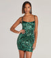 A sparkling sequin satin mini dress features a flattering scoop neckline and a corset bodice that snatches your waist along the bodycon silhouette. Perfect for the school dance or a party.