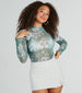 Look fresh in this floral mesh crop top perfect for brunch and spring parties! This top boasts a chic mock neckline. fitted long sleeves. and a cropped hem that flatters your figure on sheer mesh fabric with a trendy floral print. Style with a mini skort and mules to complete the look!