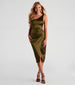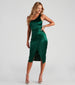 Keep it sleek and chic in the Gabriel formal satin dress sure to sweep the crowd off their feet! She stuns in a sleeveless one-shoulder neckline with a tank-style strap. a high waist seam. side pleating. and an asymmetrical slit midi hem. The formal dress is composed of silky satin fabric with sewn-in lining and minimal stretch. Complete your dressy look in strappy mules.