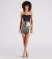 Your style is looking out of this world with this faux leather skirt featuring a sleek. high-rise waist. a bodycon silhouette. and a round mini-length hem. The metallic sheen will keep all eyes on you. Style with a corset top to complete your night out look!