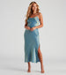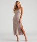Enter into a galaxy far. far away in this holographic slip midi dress featuring a sleeveless boat neckline. adjustable spaghetti straps. a curve-hugging silhouette. and a midi-length hem with a slit. Complete your chic look in a layered choker.
