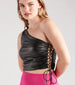 This faux leather top captures your good side for every post on social! It features a sleeveless one-shoulder neckline. a tank shoulder strap. a side ruched seam. and lace-up design. and a cropped hem. The top is composed of a faux leather fabric with a sewn-in knit lining. Complete the look in denim shorts for a trendy night out.