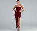 Get the scoop on the hottest new style in this sleek maxi dress! It features a sleeveless scoop neck. spaghetti straps that lead to a cross back. and a maxi length with a thigh-high slit along the asymmetrical hem. Complete the look in glitzy heels for your formal event.