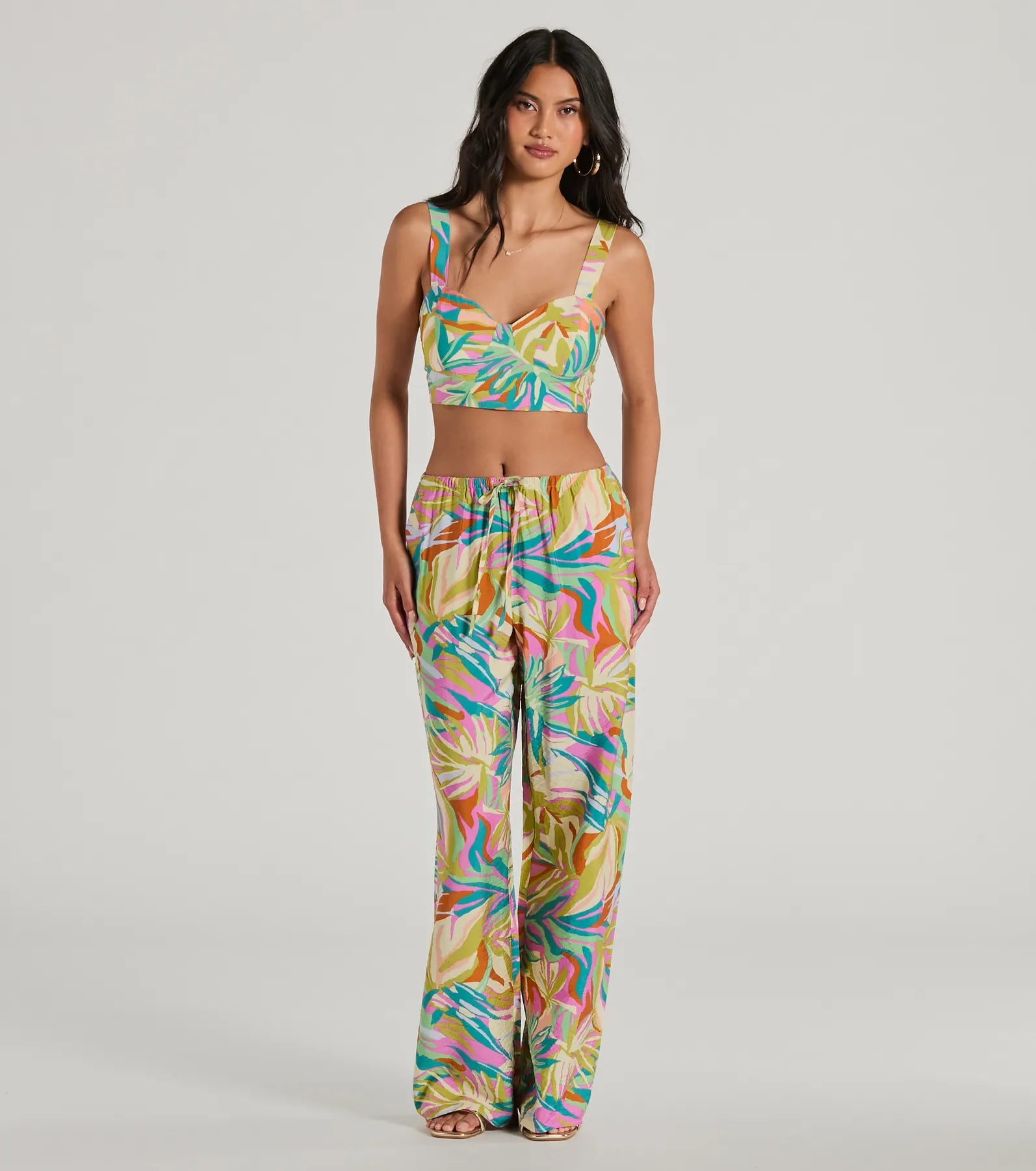 Getaway in these tropical pants for the sweetest vacay vibe! These pants feature a high rise drawstring waist so you customize the fit. side pockets for keeping your hands warm. and a flattering straight-leg silhouette. Complete the look with the matching top.