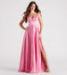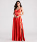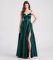 You'll be the breathtaking view in the Gillian formal satin dress at prom or black tie weddings! She features a sleeveless V-neckline with a pleated and lightly padded bust. adjustable spaghetti straps. an empire waist with hidden side pockets to keep your hands warm. and a flattering A-line silhouette with a front slit and floor-length hem. The formal dress is composed of smooth satin fabric with a woven lining and no stretch. Complete the look with a gorgeous teardrop necklace and earrings.