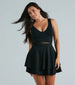 Let your date give you a twirl in this sweet crepe skater dress at weddings and dressy celebrations! It features a sleeveless plunge V-neckline. tank shoulder straps. a V-cut back. a padded bust. a flirty sheer mesh waist insert with a crisscross design and a short-length layered hem. The crepe fabric offers a moderate stretch. Complete the look in this skater dress with a sparkly rhinestone bracelet and block heels.
