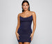 Glam it up for your night out with a mini dress that brings the glitz! The dress features a sleeveless cowl neckline. bungee straps. and a mini-length silhouette. The dress is composed of a glitter knit fabric that offers a form-hugging fit with a moderate stretch. Complete look with rhinestone heels and rhinestone earrings.