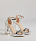 Hit the scene in glam metallic faux leather platform block heels. With a block heel. open almond toe. and chic ankle strap. these beauties are your ticket to standout style.
