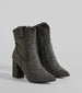 Fabulous and memorable. take these rhinestone denim booties for a glamorous look out west or at the country festival! They feature a pointed toe. side zipper closure for easy wear. a block heel. and a Western-inspired design. Complete the look in a must-have cowboy hat.