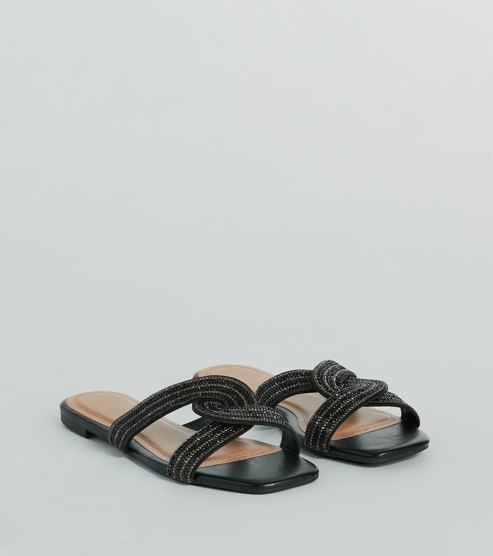 Amp up your warm-weather 'fits with these glam rhinestone strappy sandals! Made with a smooth faux leather material. these sandals feature a square-shaped toe with a curved criss-cross strap design accented with mini rhinestone embellishments for that chic sparkle. The slip-on-and-off design on the flat sole allows for effortless styling. and the lightly padded insole provides comfortable wear. Pair these sandals with hoop earrings.