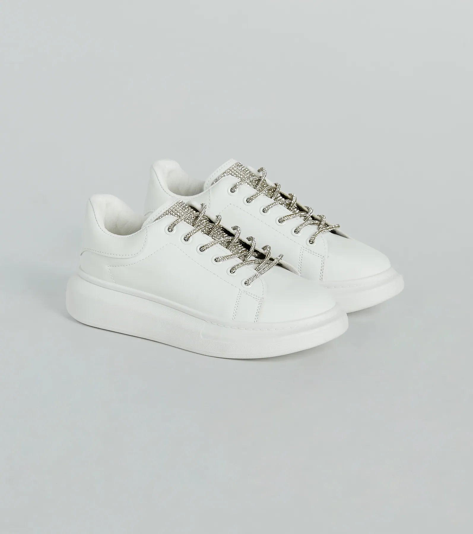 Make any outfit shine in these fashion sneakers! With a round toe. rhinestone embellished lace-up placket and tongue. a platform rubber sole. and a sleek faux leather upper. these sneakers are perfect for stepping out with your glam squad. Complete the look in a smooth knit dress to elevate your style for day or night plans!