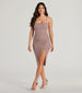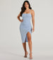 Get a glam upgrade in this glitter midi dress to shine at parties and celebrations! The square neckline and spaghetti straps that shape the lace-up back add sexiness. The asymmetrical front slit along the midi-length hem allows for a flirty peek of the leg. all in a glitter knit fabric that will make you sparkle! Complete the look in platform block heels.