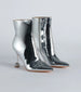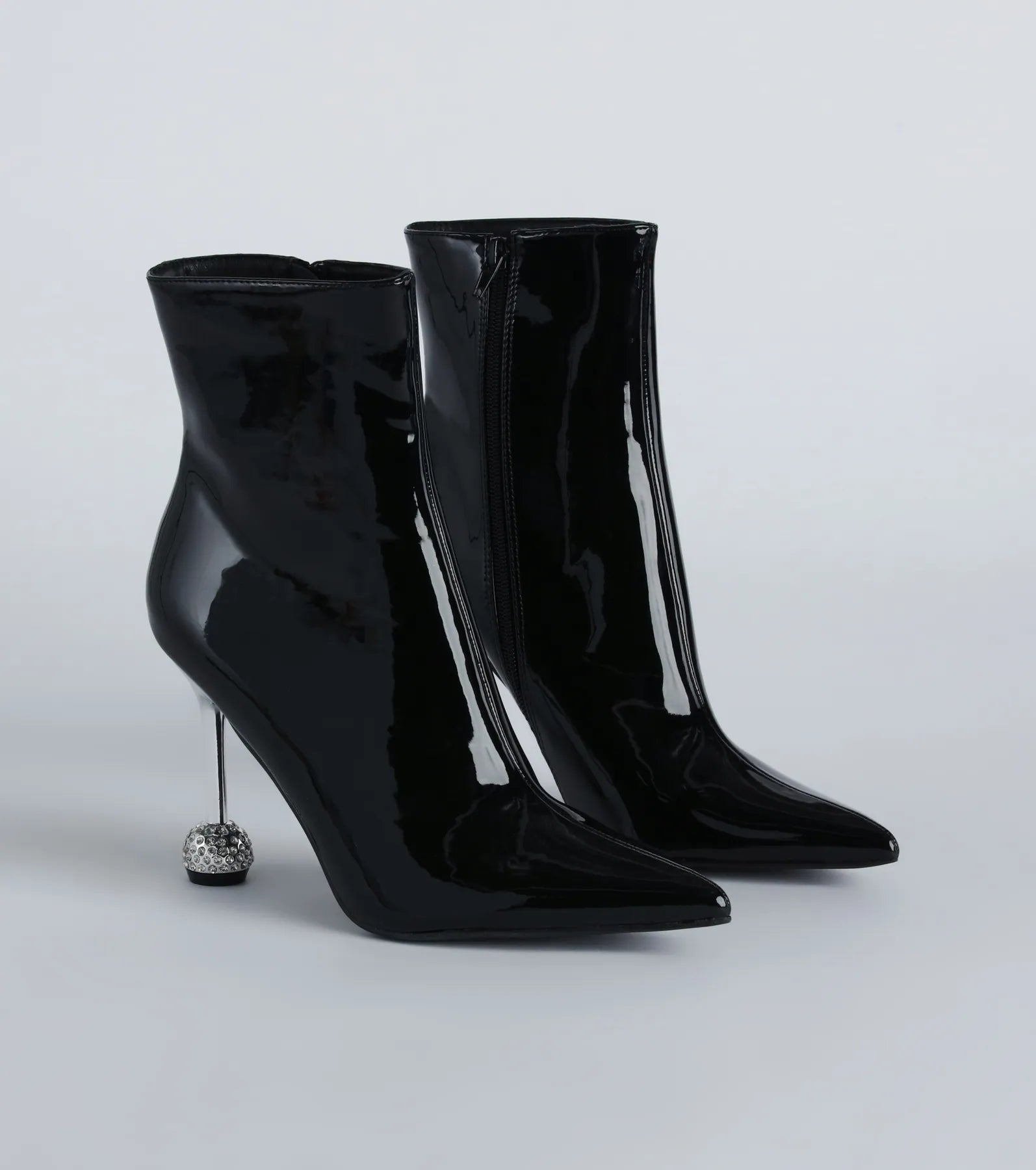 Glamorous nights are to be had in these patent leather booties! They feature a sleek pointed-toe. a stiletto heel with a unique rhinestone ball decor. an inner zipper closure. and an ankle-length shaft. Complete the look with a sparkly clutch for a birthday dinner and drinks!