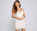 Keep it glam with a lace mini dress that is part delicate. part sultry. The dress features a sleeveless V-neckline. adjustable spaghetti straps. a corset-like bodice with piping. a floral lace body. and a mini-length silhouette. Complete look with mules.