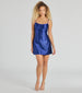 Glisten with beauty in this gorgeous glitter satin mini dress featuring a sleeveless square neckline with a flattering underbust seam. spaghetti straps. an open back with a chic cross-back strappy design. and a short A-line silhouette. Perfect for prom. style with rhinestone heels!