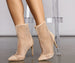 Get the extra AF look in glitter booties that glow up your look! The booties feature a mid-calf fit. fishnet body with glitter embellishments throughout. a faux suede trim. and a sleek stiletto heel. Complete look with a sleek bodycon.