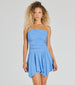Channel all the glitz and glam in this adorable glitter knit skater dress featuring a strapless straight neckline. ruched side seams. and a subtle drop waist. The pleated skater silhouette flares out to a trendy uneven mini-length hem. Style with metallic heels for a school dance or party!