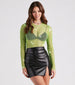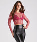 Everyone will want your style secrets after seeing you in this glitzy rhinestone crop top! It features a crew neckline. long fitted sleeves. a fitted cropped hem. and is composed of a sultry sheer fishnet fabric with all-over mini rhinestone embellishments. Style over a lacy bralette with faux leather pants for a night out.