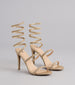 Let your glow shine through in these eye-catching stiletto heels featuring a rhinestone embellished spiral design. pointed toe. on a chrome sole. Complete your look in a short party dress for a dressy night out!
