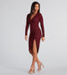 Flaunt your glow in this shimmering glitter midi dress. Featuring fitted long sleeves. an enticing surplice V-neckline. a flattering front ruched seam and bodycon silhouette. and a flirty front slit. this glittering dress makes a bold statement. Complete the look with earrings for a family dinner party!