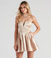 You'll look like a glowing gemstone in this gorgeous satin skater dress! It features a strapless wired V-neckline. pleated detailing at the bodice. a high waist seam. hidden side pockets. and a short skater skirt with a fit and flare silhouette. Style this adorable dress with embellished heels for all the more glow.