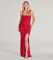 Shimmer with every step in the glam Drew glitter floor-length dress designed with a revealing open back and high front slit to show skin along the mermaid silhouette. Pair with earrings.