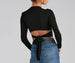 Go with those casual vibes with a top that is perf for nailing those casual fits! The top features a crew neckline. long sleeves. a lower back tie-back accent. and a cropped hem. The top is composed of a ribbed knit fabric that offers a form hugging fit with a moderate stretch. Complete look with mom jeans and chunky sneakers.