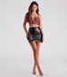 With this faux leather skirt. you'll look like a good girl gone edgy! It features a high-rise waist. bodycon silhouette. and a front side slit with a bungee lace-up design and a mini-length hem. The skirt is composed of a faux leather fabric with minimal stretch. Complete the look in a cropped cardigan.