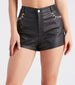 You'll look like a good girl gone glam in these rhinestone-embellished faux leather shorts! They feature a high-rise waist. sparkly rhinestone trims along the front pockets. a hidden front zipper and button closure. and a form-hugging fit. The smooth faux leather fabric offers minimal stretch. Style with a corset top and clear mules for your next night out.