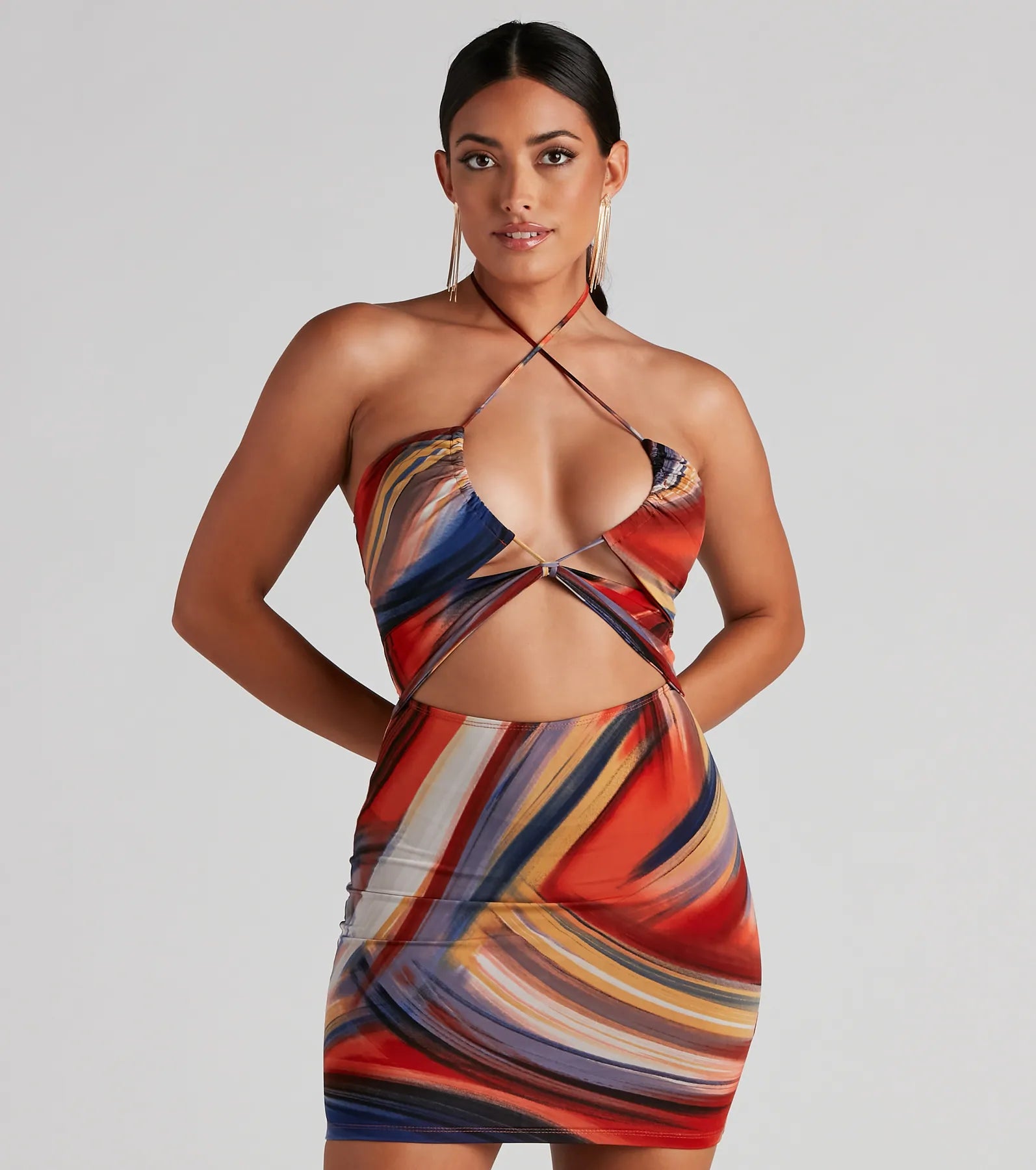 Let the good times flow in this marble print mini dress perfect for vacation and sipping mojitos! It features a sleeveless. halter neckline with a ruched drawstring and tie closure. a cutout bodice. and a form-hugging fit on the knit-lined fabric. Complete your fab look with lucite mules.