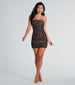 This curve-hugging mini dress will showcase a gorgeous allure to catch everyone's eye. The mini-length dress features a strapless straight-across neckline. chic ruching down the side seams for a figure-flattering look. a bodycon silhouette. and a flocked velvet design on the lined sheer mesh fabric in an intricate spiral scroll pattern. Style with lace-up stiletto heels for your next club night.