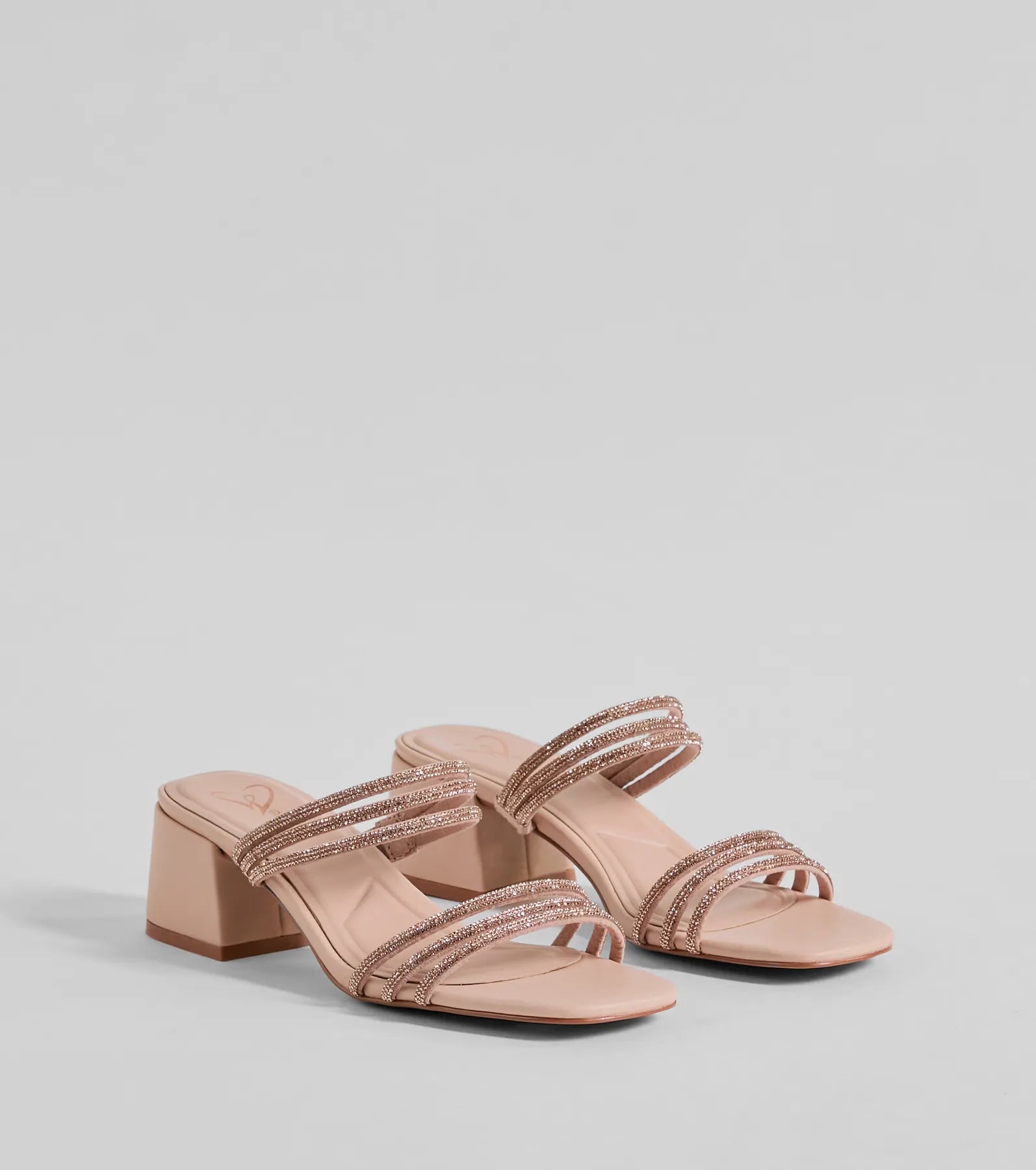 Add these rhinestone block heels for a gorgeous flash to dressy looks! They feature a sleek square toe. strappy rhinestone embellished straps. and a low block heel on faux leather material. Complete the look in a chic jumpsuit or romper for a soiree!