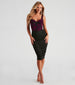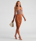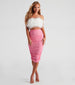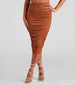 Showcase a gorgeous silhouette in this curve-hugging midi skirt! It features a high-rise waist. ruched detailing down the side seams. and a midi-length. bodycon silhouette. The brushed knit fabric offers plenty of stretch. Style with a fitted bodysuit and strappy mules.