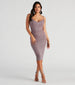 Bring the sparkle and shine to your dressy look with this gorgeous glitter knit midi dress! It features a sleeveless cowl neckline. spaghetti straps. a low scoop back with a rhinestone embellished bar strap. a high waist seam. a midi-length silhouette. and a curve-hugging fit. The glitter knit fabric offers a moderate stretch. Style with glitzy rhinestone earrings.