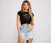 Flaunt what your mama gave ya in this stylish tee! The tee features a crew neckline. short sleeves. a script that reads: "I got it from my mama" with a small heart outline and a cropped knot hem. The tee is composed of a cotton knit fabric that offers a relaxed fit with a moderate stretch. Complete look with a mini skirt.Â