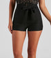 Seriously. you need these woven shorts in your life! They feature a sleek high-rise waist. with a notch accent and tie-front. a back zipper closure. and a cheeky hem. Complete the look in a bodysuit and heels.