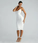 Highlight all of your best assets in the Graciela formal midi dress! She features a sexy V-neckline. sleek bungee spaghetti straps that shape the open strappy back design made to turn heads. and a bodycon silhouette and midi-length hem to flatter your figure. The formal dress is crafted from a ruched mesh fabric that fits like a glove and has a stretchy knit lining. Complete the look in a layered necklace for a bachelorette or party!