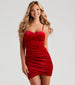 Make your picture-perfect debut at the club in this velvet bodycon dress! It features a sleeveless sweetheart neck with adjustable spaghetti straps. a lightly padded bust. corset trimmed bodice. and side ruched seams to accentuate your curves along the asymmetrical mini-length hem. Complete the look in a chic ring set.