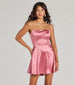Make a grand exit after your formal affair in this flirty satin skater dress! Designed with a shiny stretch-satin fabric. it features a sleek sleeveless square neckline. bungee spaghetti straps. a bold open back with a dual bar strap design. and a fitted high waist that flares out to a short skater silhouette. Complete your look with a rhinestone necklace and earrings set and block heels.