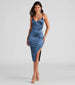 How could you not be the guest of honor in this sultry stunner! Make your entrance in this satin midi dress featuring a classy. sleeveless V-neck. spaghetti straps. and a pleated waist leading the form-fitting silhouette with a sexy side slit. Complete the look in a dainty ring set and heels.