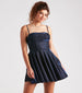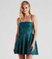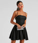 Light up the room in the Gwen party dress showcasing major shine in her glittery. twirl-worthy silhouette! She features a sleeveless. cowl neckline. adjustable spaghetti straps. a built-in padded bust. corset-style bodice with flexible boning. Her high waist seam leads to the short. A-line skirt with hidden side pockets to keep your hands warm. The formal dress is composed of a woven glitter fabric with a knit lining and minimal stretch. Complete your flirty look with a rhinestone hair clip and heels.