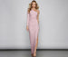 Create a dreamy. picture-perfect look in the Haley shimmering glitter knit formal dress. She features an asymmetrical one-shoulder neckline. a single long fitted sleeve. ruched detailing down one side. a floor-length. form-hugging silhouette. and an asymmetrical hem creating a thigh-high side slit. Style this dress with rhinestone heels.