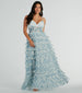 Cascading with romantic ruffles. the Halle floral formal dress is something of a dream! Be a vision in this gown at weddings. banquets. and fancy soirees. Made from an airy mesh fabric with a gorgeous floral print. you'll be a breath of fresh air. Boasting a V-neckline and adjustable spaghetti straps for a tailored fit. this dress also features padded bra cups for coverage. The sheer corset bodice pleated ruching and flexible boning add a touch of allure. while the A-line ruffled silhouette and floor-length hem exude glamour. Complete the look with a beautiful hair headband. clutch. and heels for a decadent style!