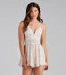 You'll be one happy flower in this adorable V-neck romper featuring a sleeveless bodice. adjustable spaghetti straps. and a sheer crochet waist atop flowy shorts on floral printed chiffon fabric. Complete the look in sandals for the perf spring outfit.