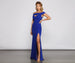 Making a captivating impression in a dress that brings the elegance! Harlowe features an off-the-shoulder neckline. a sexy v-shaped cutout at the bodice. padded cups. and an A-line silhouette accented with a high side slit. The dress is composed of a lined crepe fabric that offers a form-hugging fit with a moderate stretch. Complete look with glitter mesh heels.