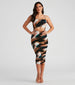 Make heads turn in this eye-catching chic bodycon midi dress! It features a sleeveless square neckline. spaghetti straps. bold front and back waist cutouts. ruched detailing down the side seams. and a midi-length. curve-hugging silhouette. The stretchy knit fabric features an all-over abstract marble print pattern for a trendy vibe. Complete the look with clear heels.
