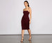 Bring the romantic vibes in this casually-chic midi dress! It features a sleeveless bodice with a square neckline. bungee spaghetti straps. a square back. ruched detailing. and a mid-length. curve-hugging silhouette. Pair this dress with strappy heels and a sleek clutch to complete your look.